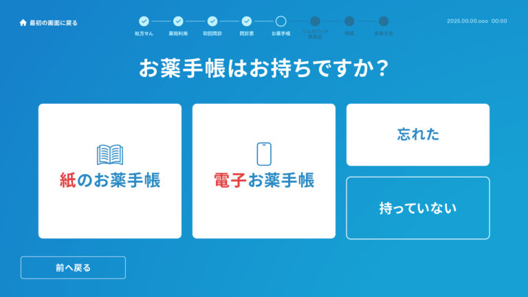 「お薬手帳の有無」「ジェネリック希望」「残薬確認」など、 薬局様ごとに事前に設定したアンケートに画面上で患者様が回答いただけます。 口頭での確認工数を減らし、聞き漏らし防止にも役立ちます。